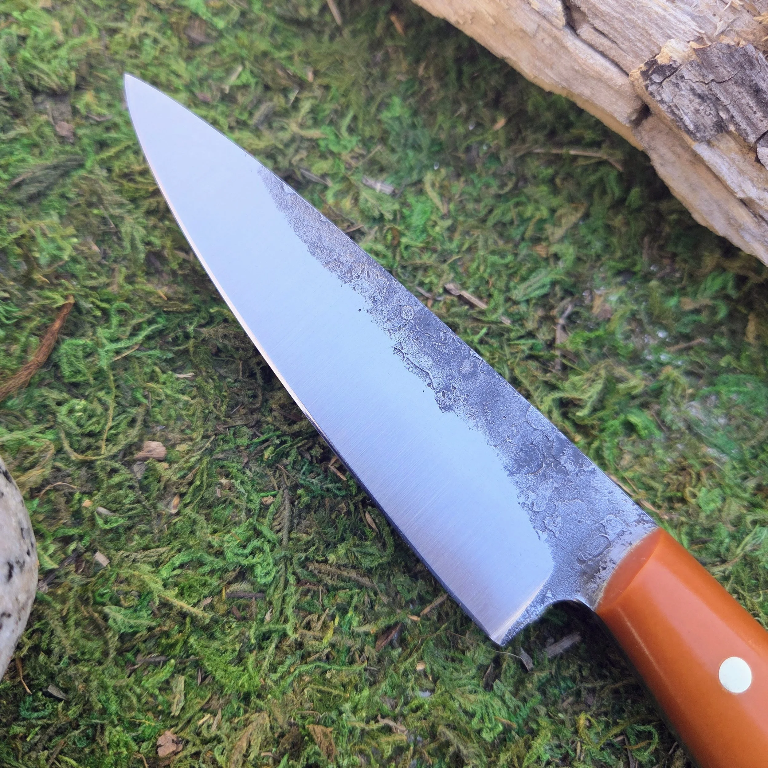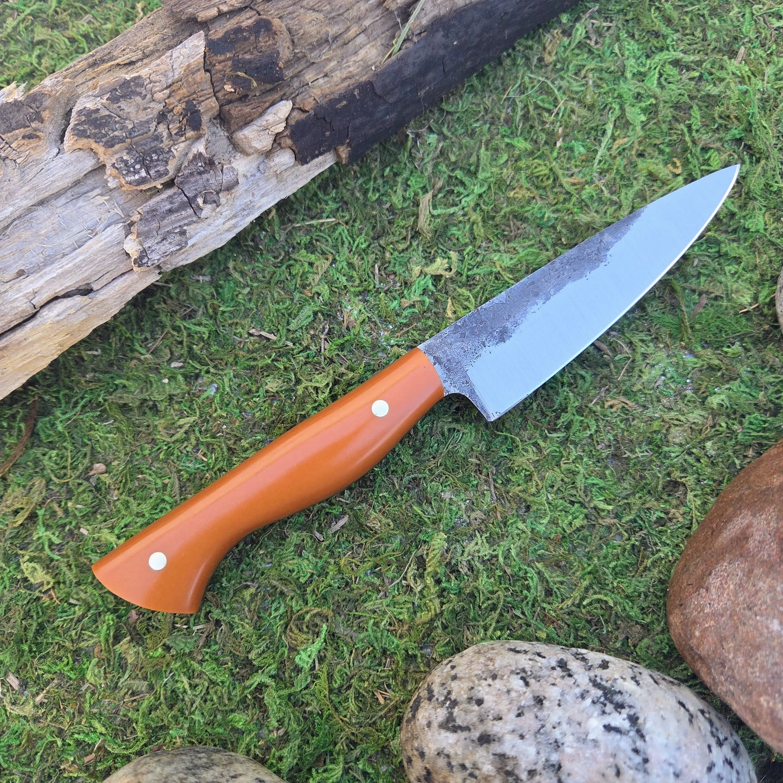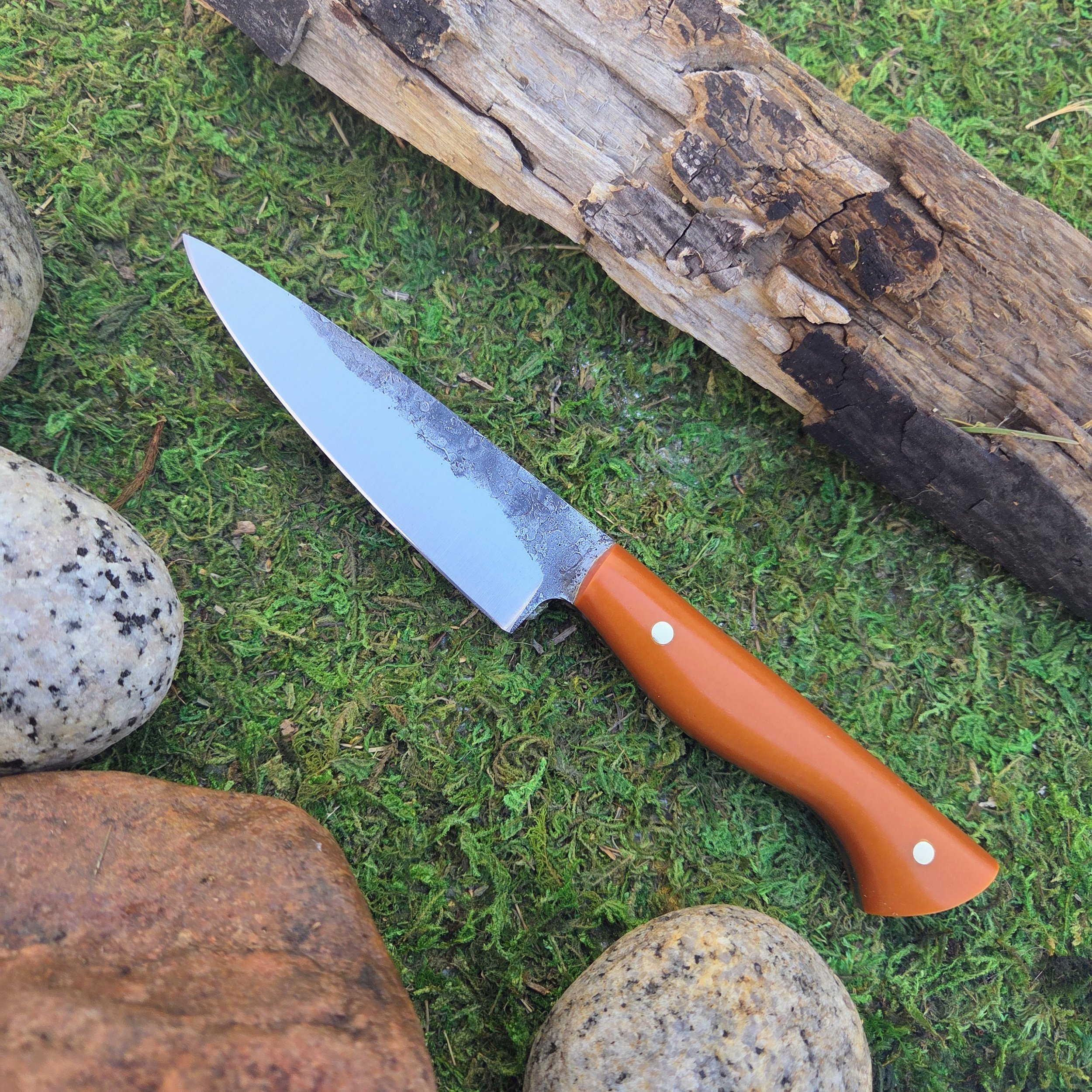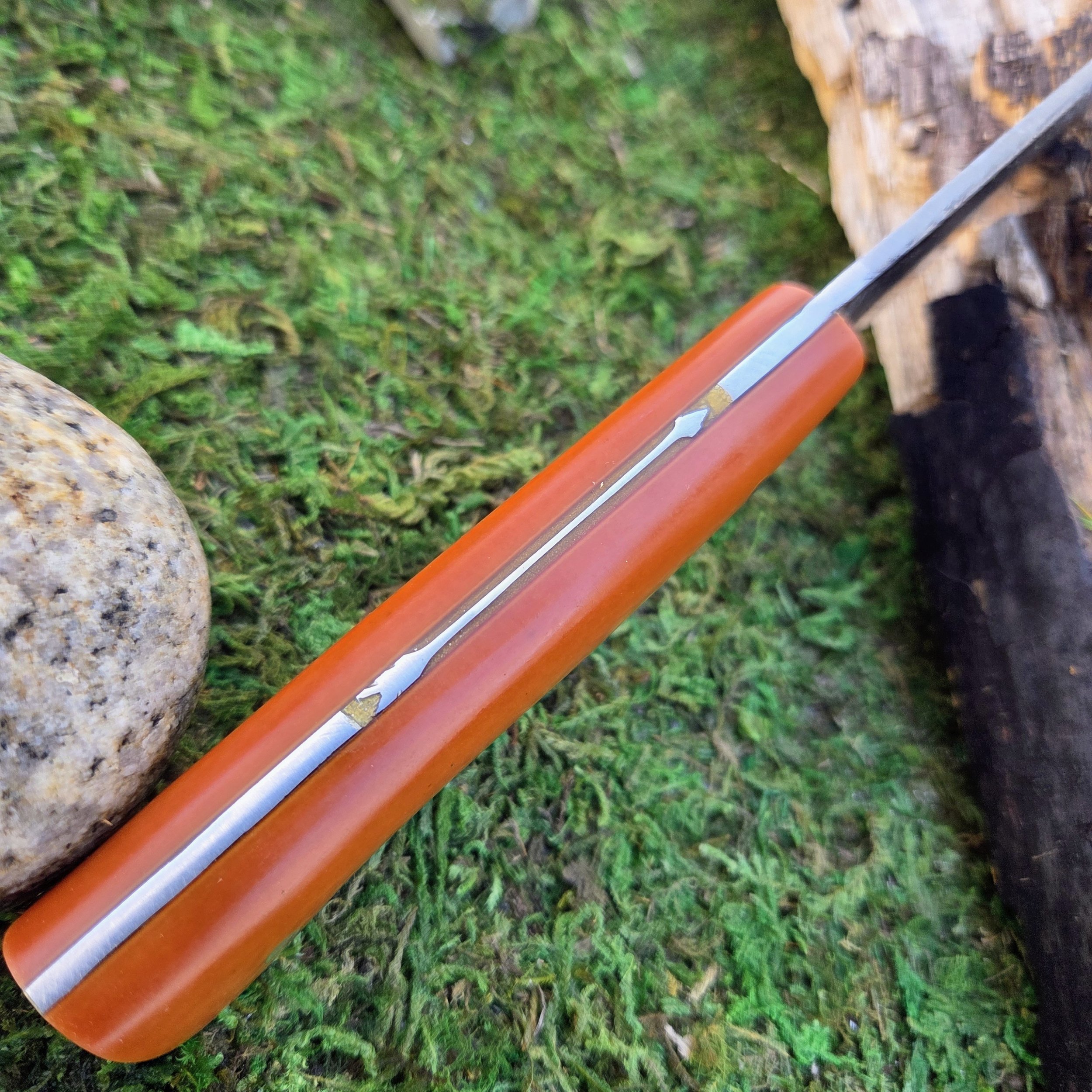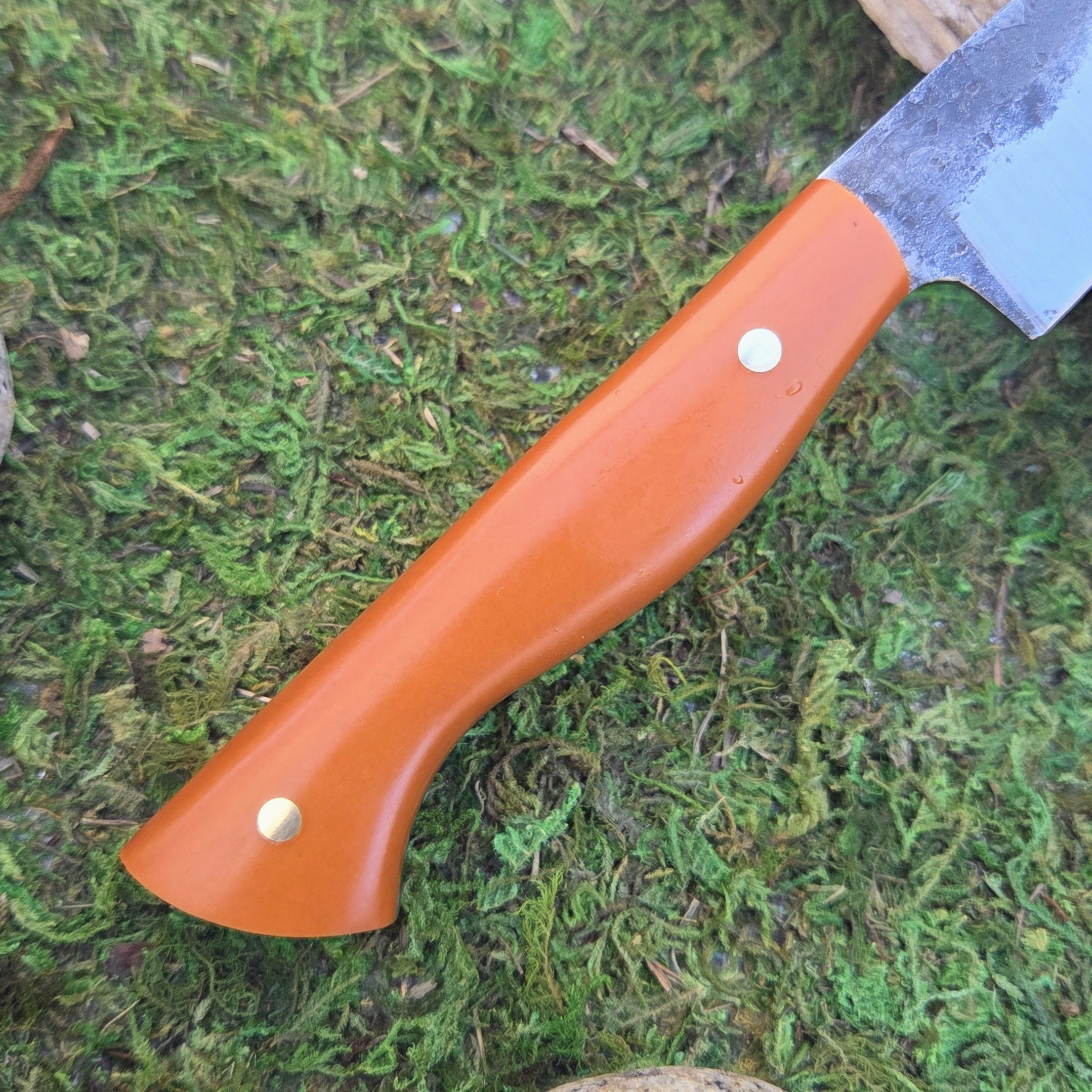 Forged as a demonstration for students at Hardy and Fuller, This bushcraft knife is made of 1084 high carbon steel, fitted with reclaimed butterscotch orange industrial g10 scales. The full tang construction is fitted with brass pins and decorated with filework on the spine.