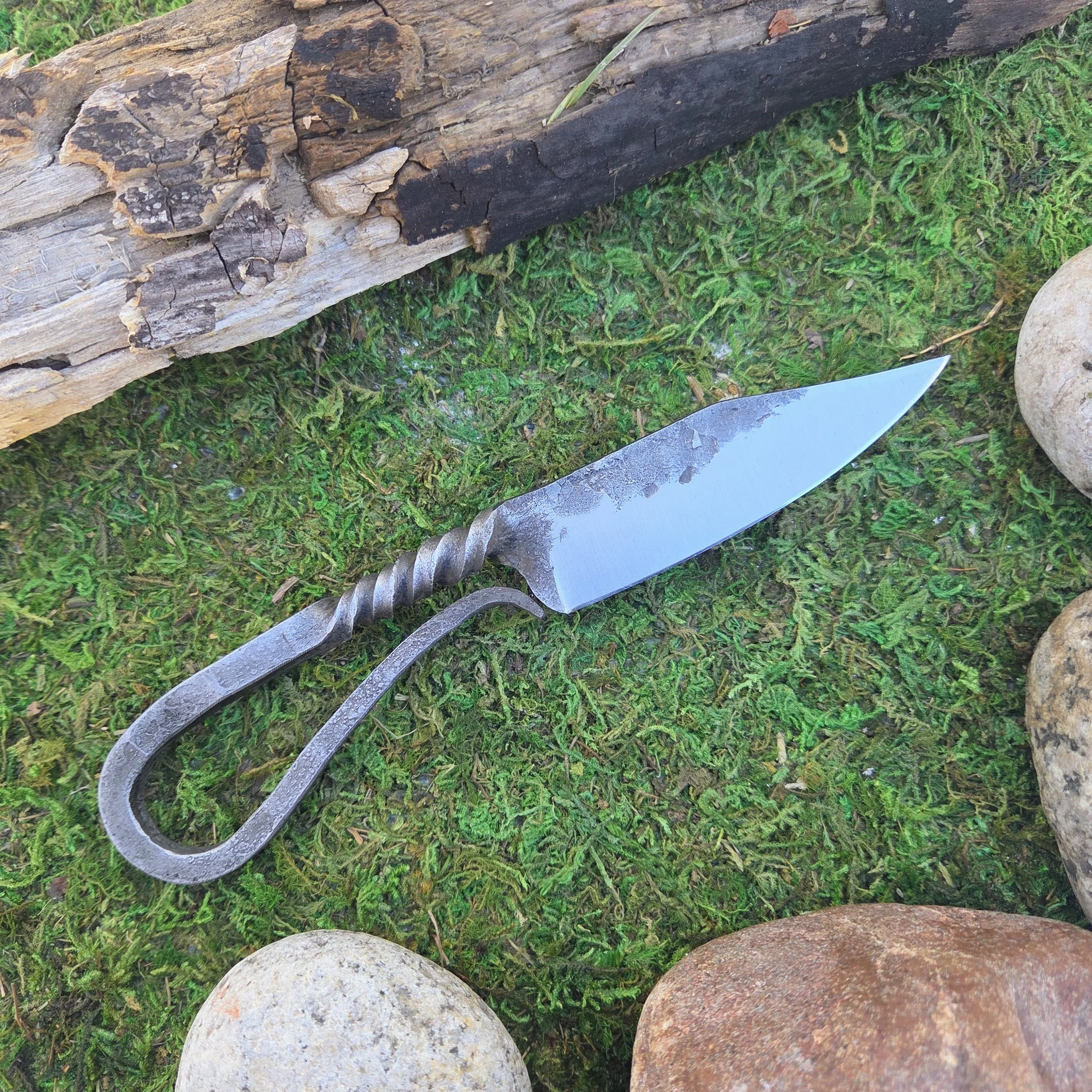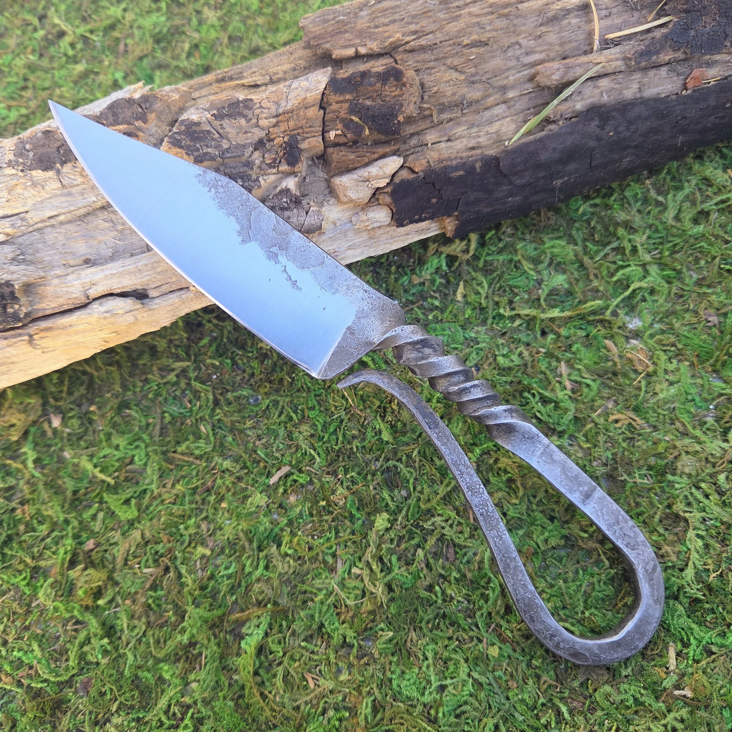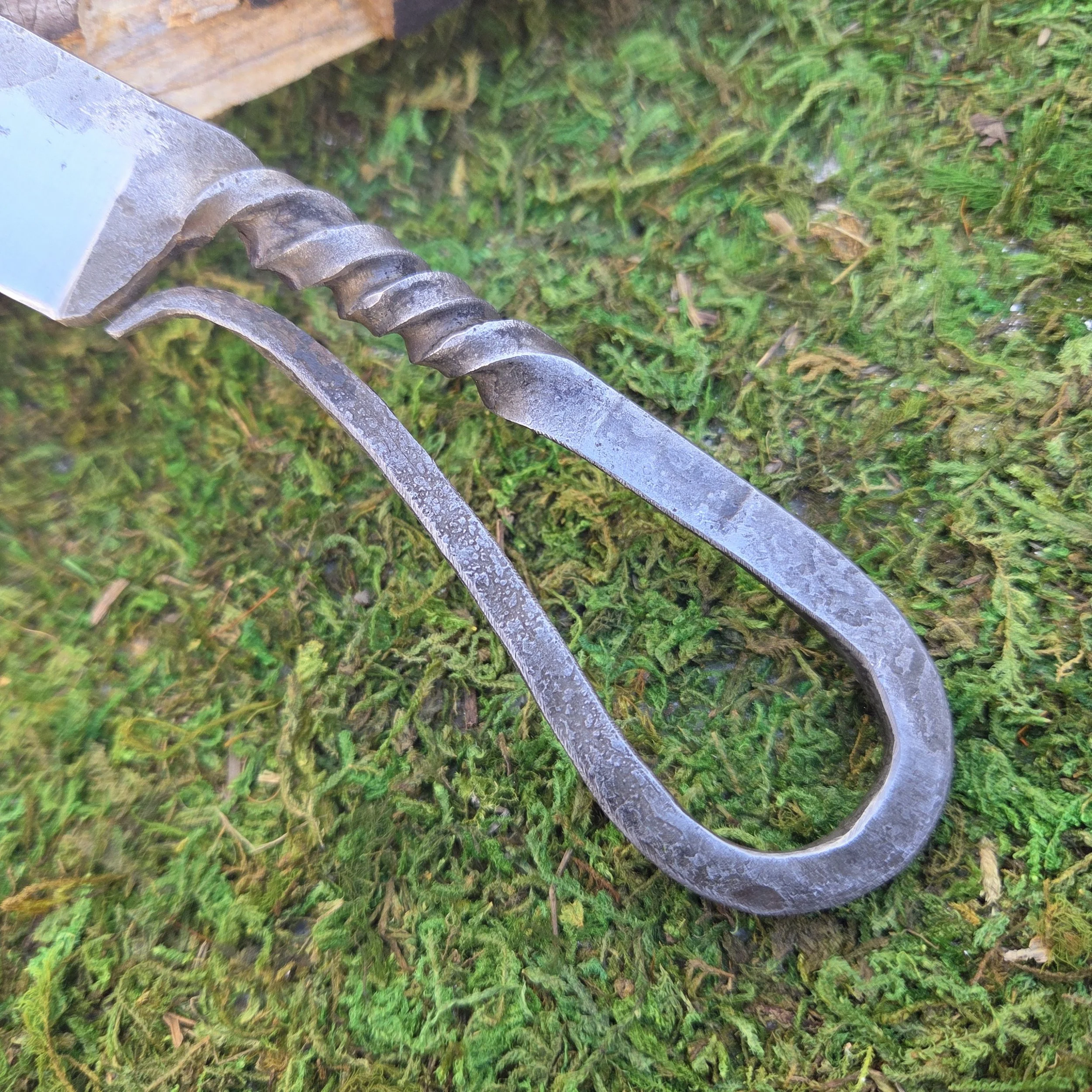 Forged as a demonstration for students at Hardy and Fuller during my Viking Knife class, this is made of 1084 high carbon steel.  The  tang is drawn out into a long, slender taper and wrapped around to form a surprisingly comfortable handle in an old school style.